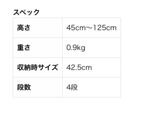 伸高45〜125cm、収納サイズ42cm、0.9kg、4段