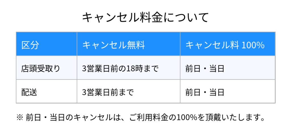 ・店頭受取り → 3営業日前の18時まで = キャンセル無料、前日・当日100%の料金が発生。